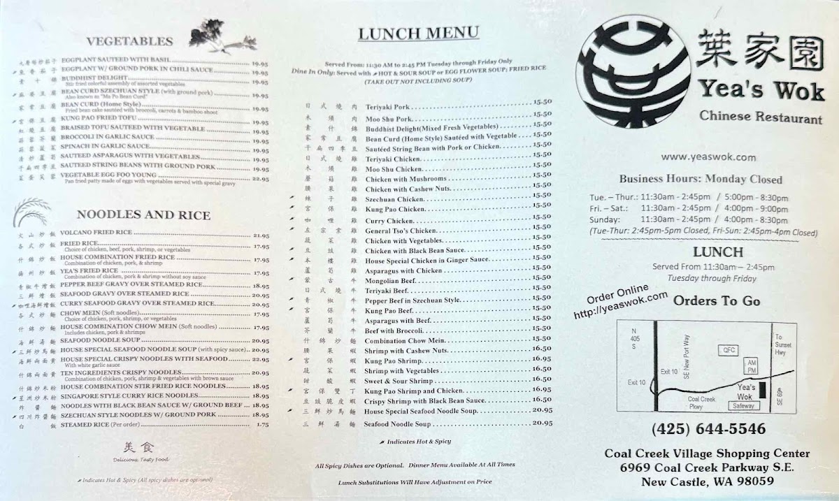 Welcome to Yea's Wok, your new go-to Chinese restaurant nestled in Newcastle, WA. Situated at 6969 Coal Creek Pkwy SE, this hidden gem boasts a distinguished menu that embraces traditional Chinese cuisine with a modern twist.